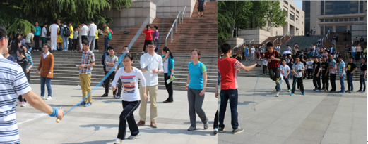 集体项目给同学们带来了很多欢乐,在四大发明广场上,拔河、踢毽子都热火朝天。还有老师和同学们正在进行的集体跳大绳比赛,绳子在他们身边欢乐的飞舞。团结的力量使得大家获得了较好的成绩。