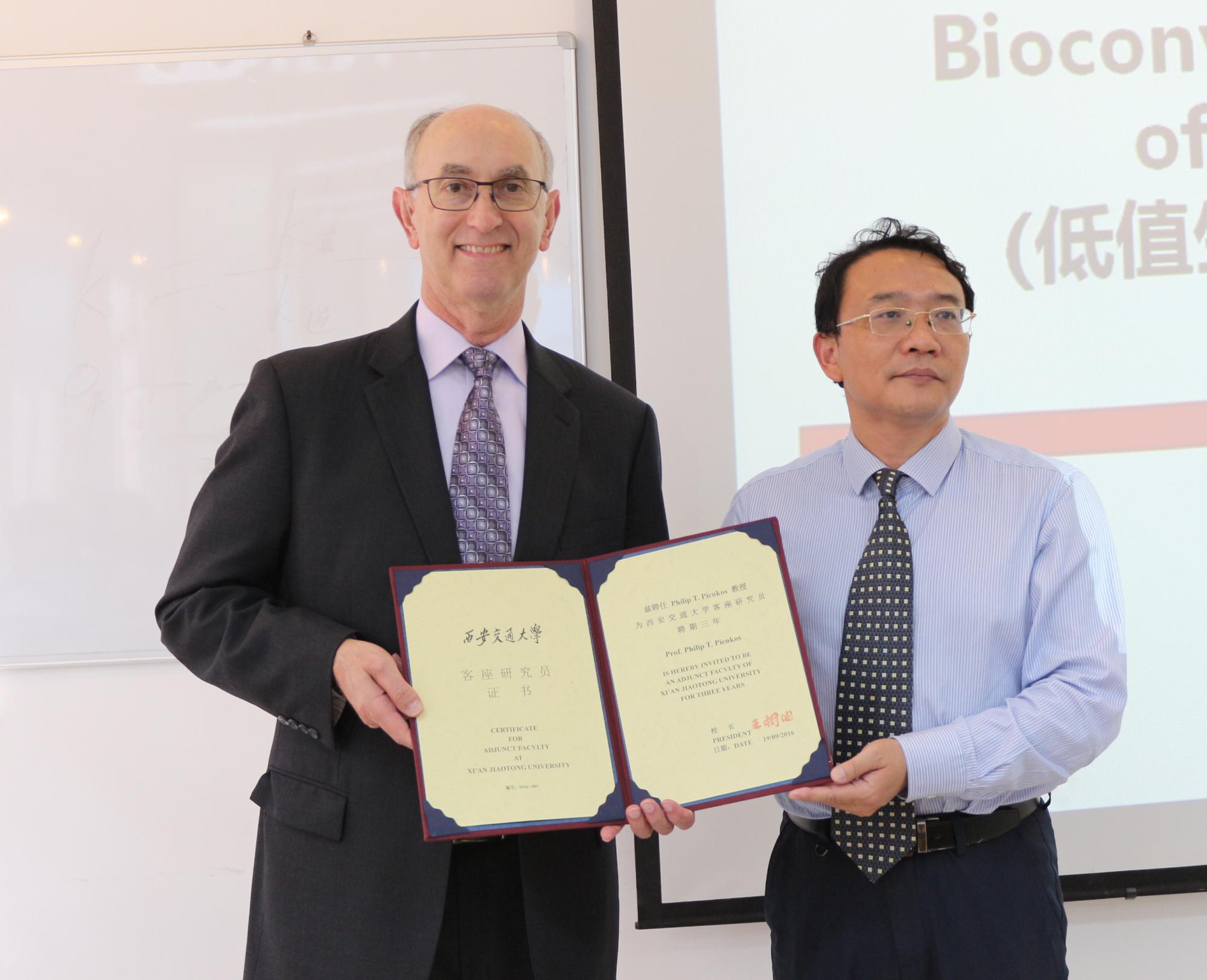 在生物化工学科和生物能源的发展,对相关的前沿进展和培育战略性新兴产业等方面起到积极的促进作用。随后,席光副校长代表学校为Philip Pienkos宣读聘词、颁发聘书并佩戴西安交大校徽。