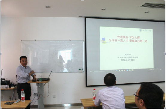 吴教授通过生动形象幽默风趣的故事逐条讲解,发人深省的同时更加明确了好导师的标准和目标。最后,吴教授指出了目前在学校、学院及导师关系方面存在的不足和改进的措施,三者应在清楚相应责权的同时建章立制,营造师德文化,加强导师考核制度,尤其是非学术素养的考核,并且加强监督检查和思想政治工作。学院教师与吴院长进行了提问互动。