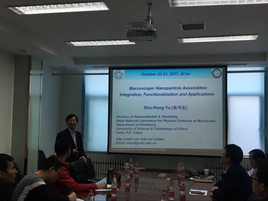 北京大学张锦教授和中国科学技术大学俞书宏教授于10月22日分别作了题为《Chirality-Predicted Growth of Horizontal Carbon Nanotubes Array with Designed Catalysts》、《无机材料的仿生合成、组装及应用》的第二场报告,张锦教授从碳纳米管的生长机理及其碳纳米管研究面临的主要问题着手,深入浅出的介绍了多种想法奇特的催化剂制备手段,尤其在利用“特洛伊”催化剂调控单壁碳纳米管手性方面的工作开阔了大家的视野,在场的师生深受启发。俞书宏教授从利用分子模板诱导仿生合成、纳米结构单元可控合成与组装以及宏观尺度纳米组装体仿生制备与功能化等方面阐述了近年来课题组所取得系列创新成果,并详解了纳米材料有序“组装”带来的一些神奇效应。报告会现场互动气氛热烈,参会师生踊跃提问,张教授和俞教授耐心细致的解答博得阵阵掌声。