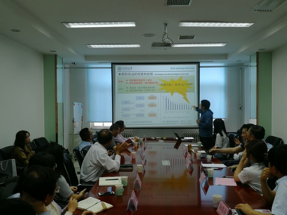 、电气学院、能动学院的多名教师分别以“氢燃料电池产业概况及大湾区项目介绍”、“低温质子陶瓷燃料电池材料及制备工艺”、“高密度储氢材料/系统及与燃料电池的集成”、“基于固态储氢氢燃料电池动力集成系统”、“SOFC应用和产业化&高性能质子交换膜燃料电池双极板的设计与开发”、“低成本直接甲醇燃料电池及催化剂开发”等为题介绍了各自在氢燃料电池及相关领域的研究成果。来访客人就报告内容频频提问,并从用户角度更清晰地界定了实际需求,现场互动气氛热烈。