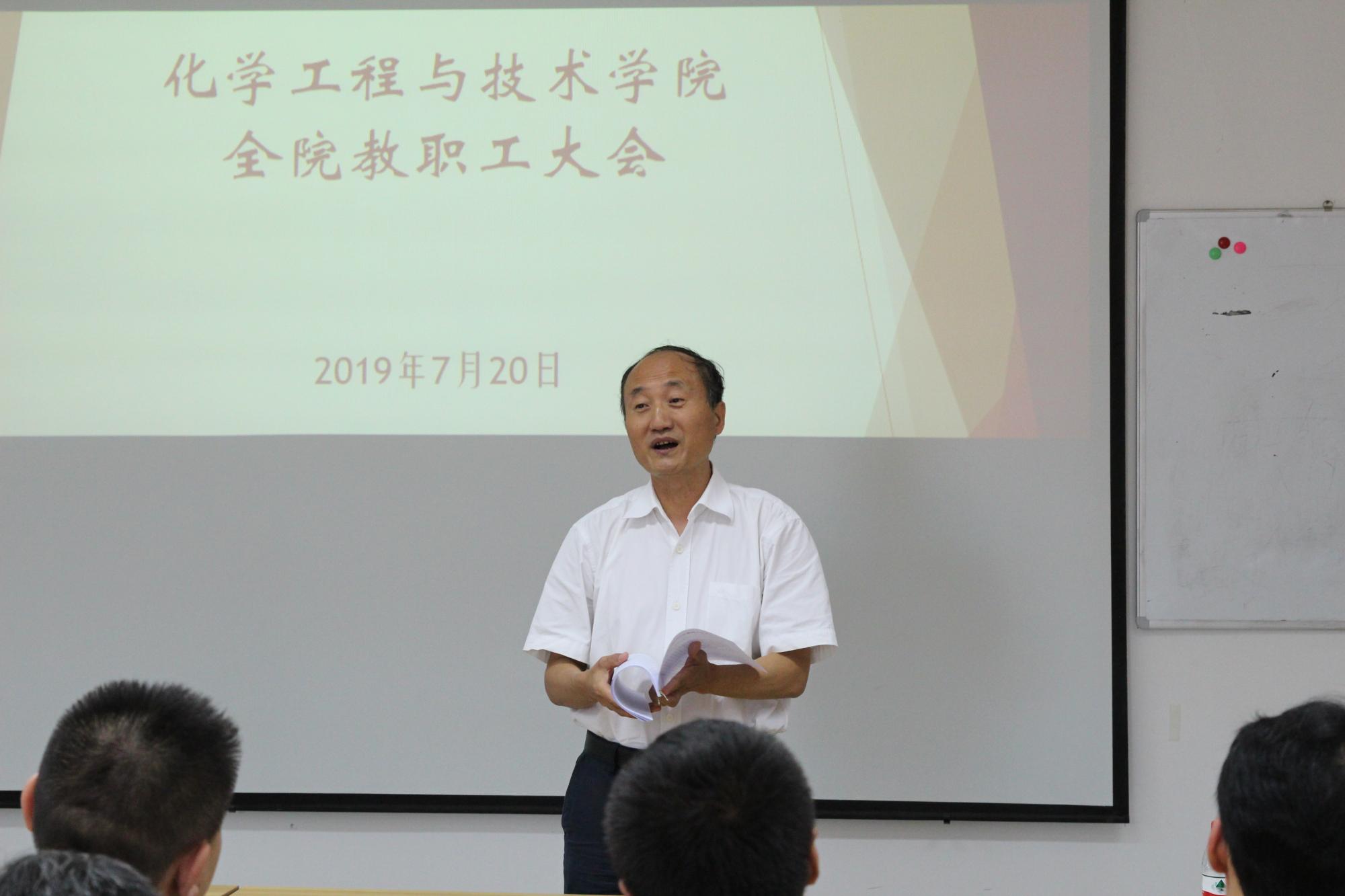 7月20日下午,院长魏进家向全院教职工传达了王树国校长暑期工作会议报告精神,对学院上半年工作任务完成情况作梳理,对学院下半年工作任务作部署。他希望全院教职工在学校和学院良好发展形势下辛勤付出,加班加点,齐心协力做好化工研究院入驻创新港等中心工作,完成下半年各项工作任务,为学院和学科发展积极贡献力量。分党委书记张早校向全院教职工传达了张迈曾书记暑期工作会议讲话精神,并作动员讲话。他再次强调了8月15日确保研究生入驻创新港的“硬任务”,要求全院教职工认真总结思考上半年工作的亮点和缺陷,补齐短板,刚性落实2019年工作任务。一是抓学习、树信念;二是抓落实、不打折;三是抓宣传、造氛围。希望全院教职工在学科评估的关键节点上“干出好样子”,在年底交出一份满意答卷。会议同时对综合治理、研究生暑期实践等工作作布置。
