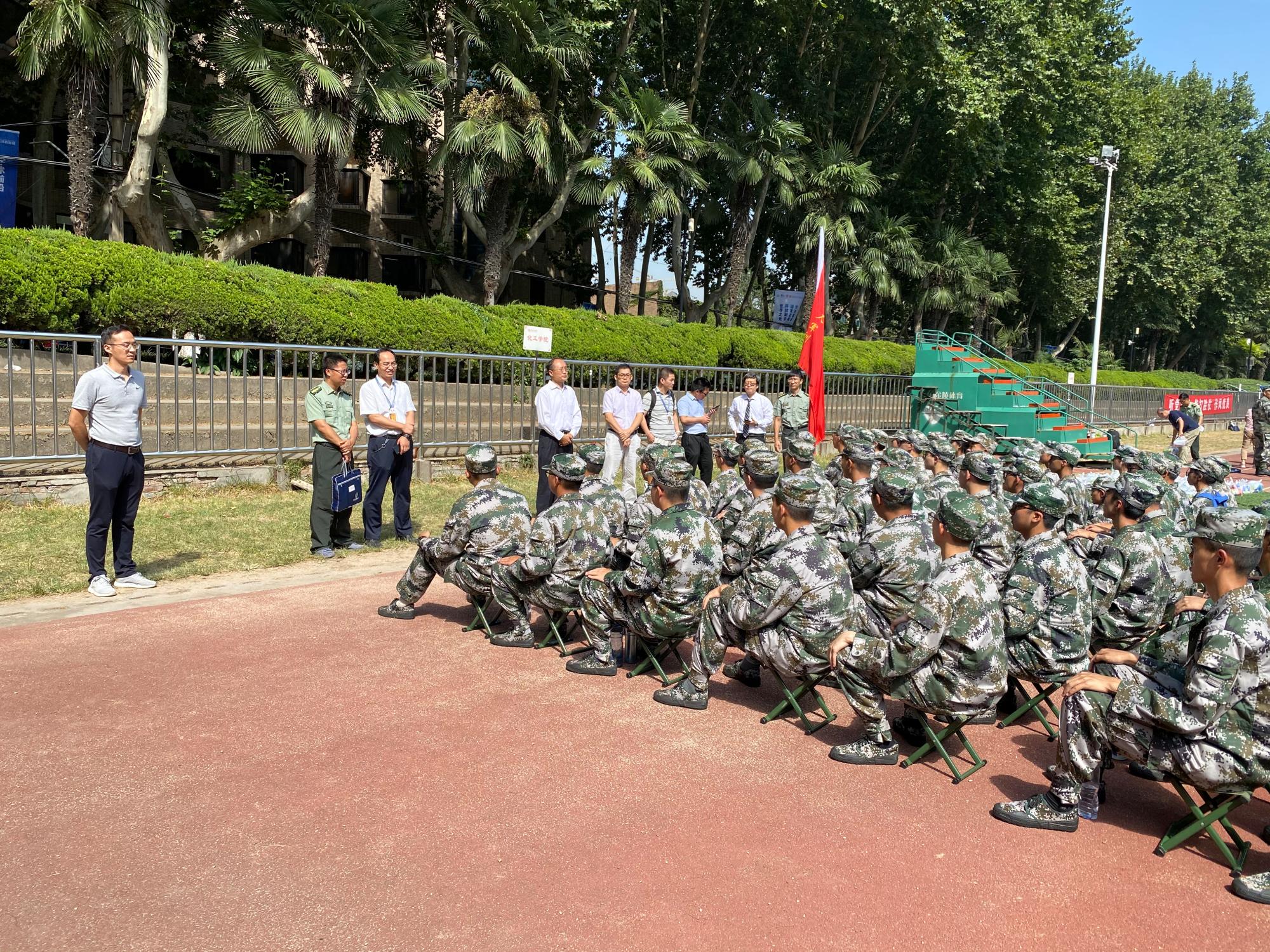 张早校书记、沈人杰副书记和系负责人及新生班主任看望慰问了参加军训的2020级本科生、教官和带队老师。