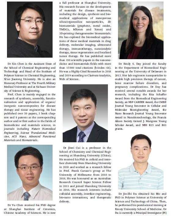 陈鑫教授入选英国皇家化学学会旗下Journal of Materials Chemistry B期刊2020年度新星科学家(Emerging Investigators)(见下图中第一位)。该荣誉针对在材料化学领域有重要创新性研究成果的优秀青年科学家,他们在材料化学领域取得的成果被认为有望影响未来材料化学的发展方向。同时陈鑫教授也受邀请在2020年度JMCB Emerging Investigators专刊上发表学术论文,该专刊收录了生物材料化学领域青年科学家近年来的高质量前沿成果。