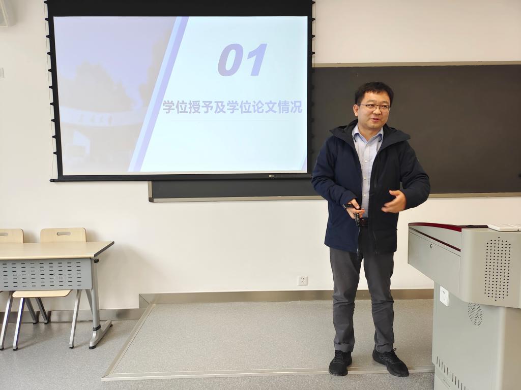 研究生院副院长刘明教授从学位授予及学位论文情况、质量保障与警示案例、导师队伍管理及研究生院下一步工作计划等四个方面,向参会导师详细解读了学位质量20条及导师立德树人和导师遴选的政策要求。刘院长指出质量是学位与研究生教育的生命线,要坚持学位授予的底线思维,牢牢抓住学位论文开题、中期考核、评阅、答辩、学位评定等关键之处,细化流程、压实责任。刘院长同时强调导师要严格把关学位论文研究工作、写作发表、学术水平和学术规范性,进一步提高研究生培养质量。