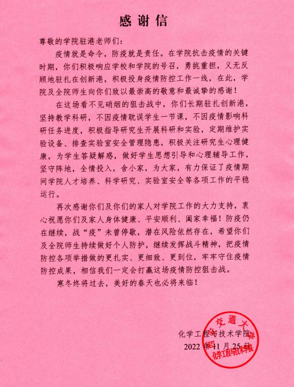 再次感谢你们及你们的家人对学院工作的大力支持,衷心祝愿你们及家人身体健康、平安顺利、阖家幸福!防疫仍在继续,战“疫”未曾停歇,潜在风险依然存在,希望你们及全院师生持续做好个人防护,继续发挥战斗精神,把疫情防控各项举措做的更扎实、更细致、更到位,牢牢守住疫情防控成果,相信我们一定会打赢这场疫情防控狙击战。