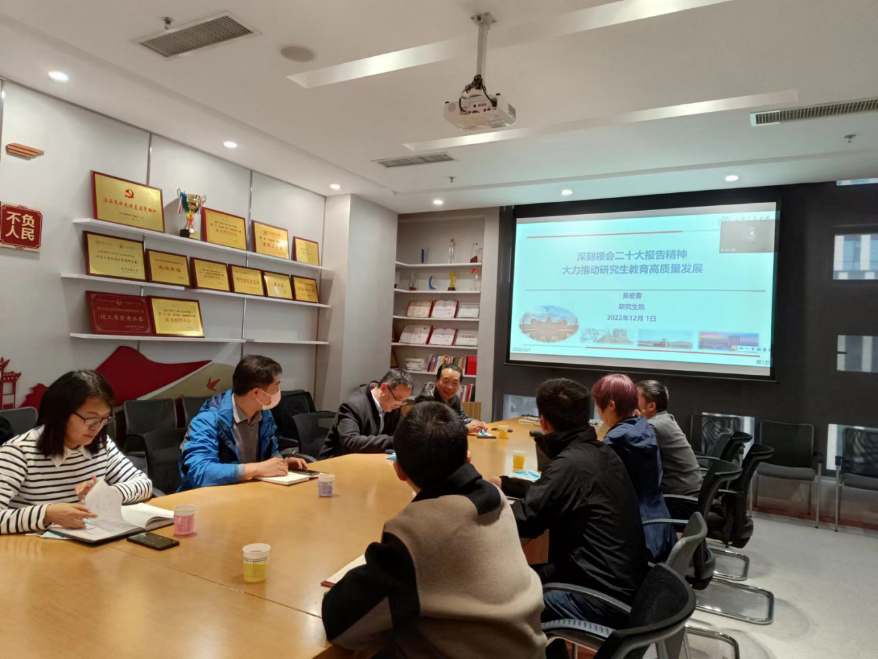 在创新港19-3183会议室召开了中心组学习暨教职工党支部书记例会,会议邀请研究生院常务副院长、吴宏春教授做题为《深刻领会二十大报告精神大力推动研究生教育高质量发展》专题辅导报告,会议由分党委书记苗晋英主持,院领导班子成员、党委委员、教职工党支部书记参会,90多名教职工线上观看。