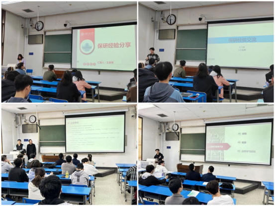 在保研分享交流环节,化工专业的王家慧、王力扬同学以及装备专业的赵天昊、罗一洋、蒋欣宇同学分别结合自身经历,从保研流程、校内外选择、校外夏令营、科研训练、材料准备等方面具体展开,各有侧重的介绍了准备工作和注意事项,向同学们提出了宝贵建议。已保研至上海交大的赵天浩同学详细分析了动力工程与工程热物理专业较强的多所985高校的特点、优势及劣势,帮助大家进一步明确方向。蒋欣宇同学表示,学分绩点和比赛活动是取得保研资格的主要方式,他向大家介绍了参加大创科研训练的重要性,并以自己的参训经历为同学们提供参考。王力扬同学结合自身参加夏令营保研外校的面试经历,向同学们传授了具体的面试技巧,鼓励大家勇敢尝试。