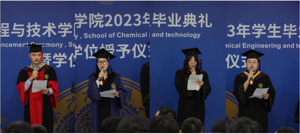 四位毕业生代表分别进行发言,分享各自在学院的成长和收获及对未来的美好展望。博士生代表王满分享了博士学习的经历以及对科研工作的几点感悟,强调持之以恒的努力和探索以及团队精神的重要性;硕士毕业生郭孟亚畅谈在创新港新环境中与班级同学一起生活、科研的美好时光,本科生代表张柯和王家慧在发言中分享了四年大学生活的紧张忙碌以及顺利保研的经历,感恩学校和学院带给他们思想上的进步,号召全体毕业生继续发扬西迁精神,始终铭记自己是交大化工人,为祖国的繁荣富强做出贡献。