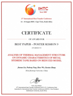 固态储氢与燃料电池课题组刘家璇同学投稿的论文“Analysis of thermal management structure on dynamic characteristics of metal hydride tank based on reduced model”获评Best Paper Award(最佳论文奖)。该论文作者为博士生刘家璇、杨福胜教授、吴震教授和张早校教授,吴震教授代表全体作者接受国际传热会议组织(The Assembly for International Heat Transfer Conferences)现任主席、清华大学张兴教授颁奖。