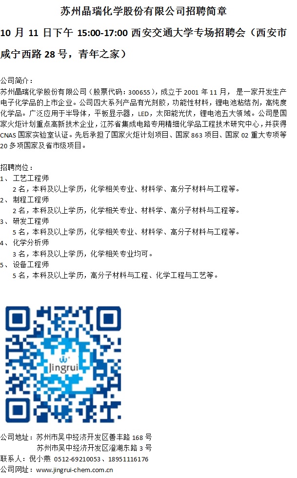 苏州晶瑞化学股份有限公司招聘