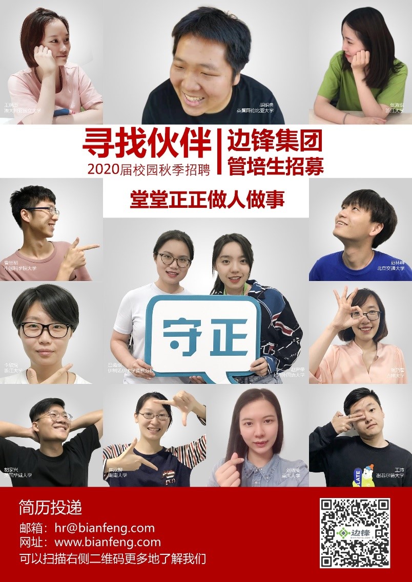 作为管培生的你,必将经历痛苦的涅槃。从无到有,从0到1,你既是参与者,更是设计者。期待能与你一起创造出属于边锋、属于90后的管理者成长之道。