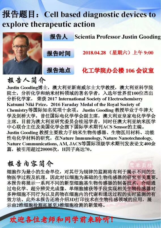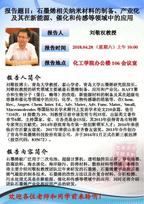 04月28日澳大利亚科学院院士Justin Gooding、青岛大学石墨烯研究院院长刘敬权教授讲座