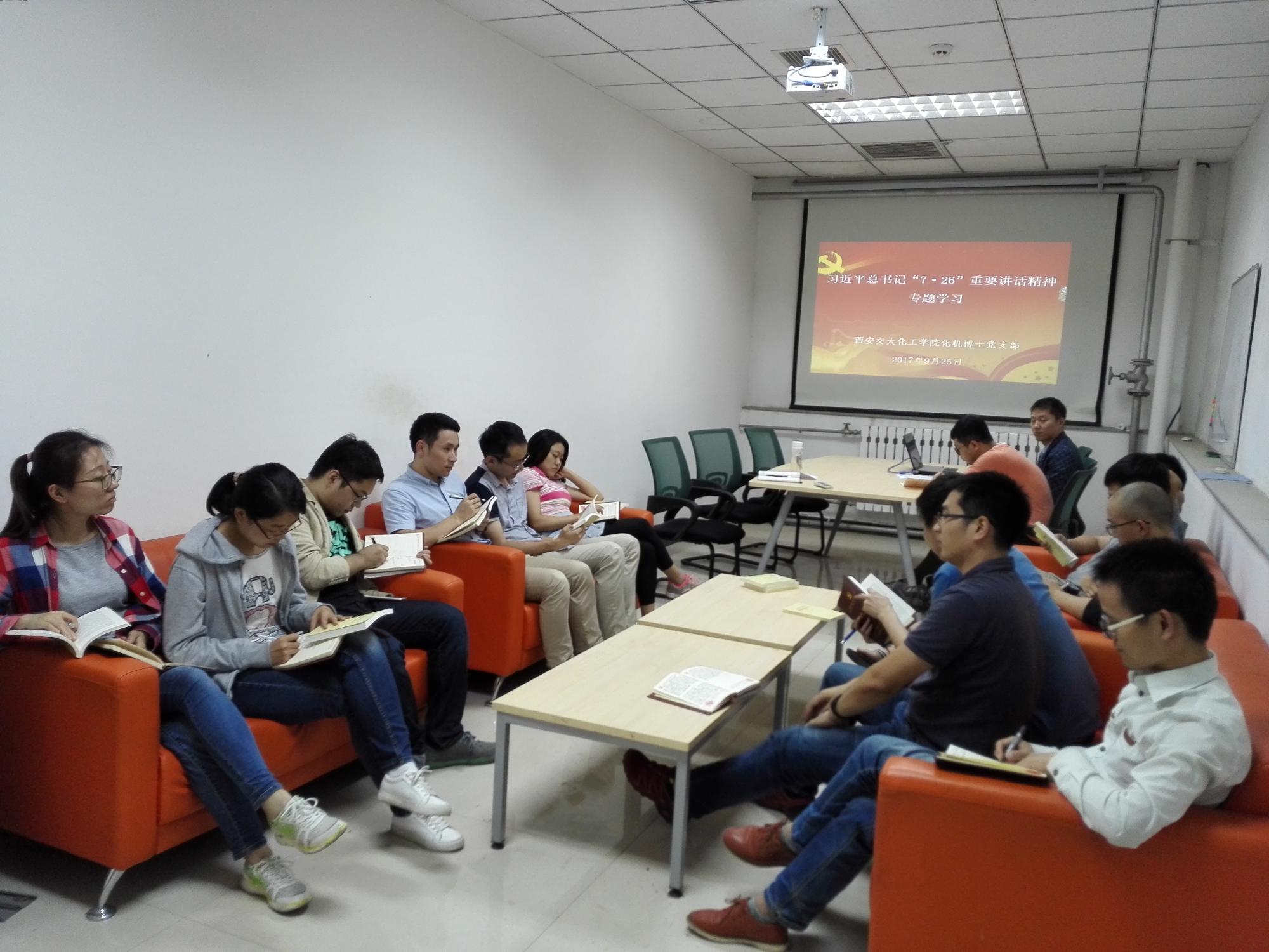 实验楼401召开支部党员大会,专题学习习近平总书记“7.26”重要讲话精神。会议由支部书记张洋主持,化机博士党支部全体成员参加了会议。