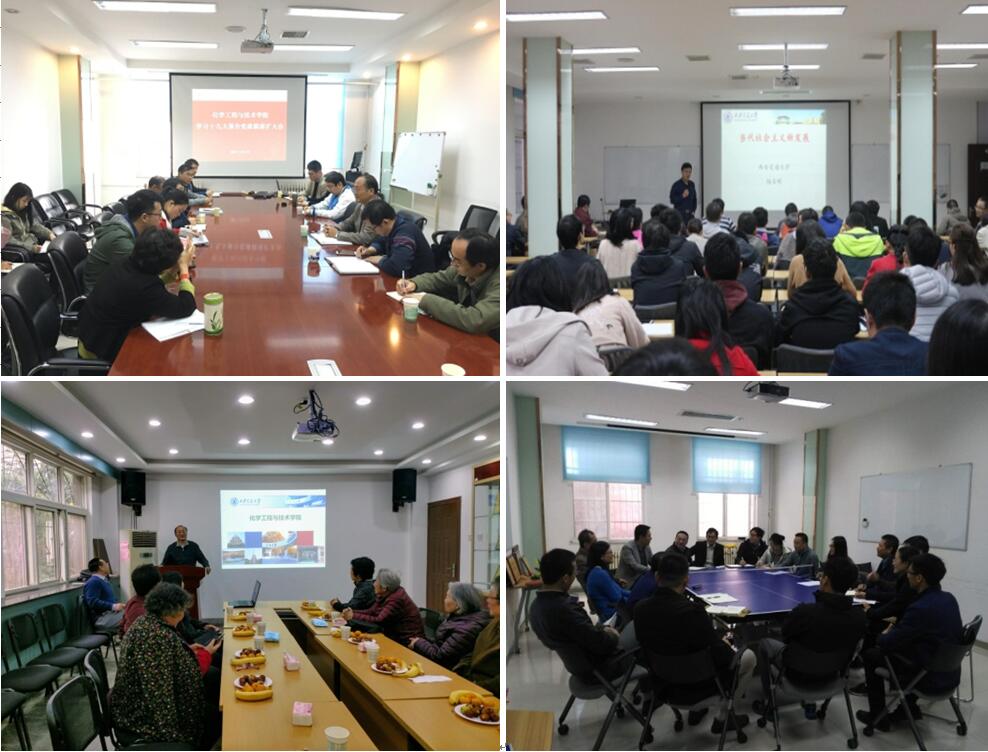 闻令而行,迅速行动,在十九召开的第二天上午,91porn 就召开了学习十九大报告党政联席扩大会,学习并布置学习十九大相关工作,会上师生纷纷联系各自工作积极发言,畅谈观看十九大开幕式的感受以及对工作的一些想法和建议。会后根据学校安排制定了《91porn 党总支贯彻落实学习十九大报告精神学习计划》,对十九大精神的学习、宣传和落实等工作进行了部署,提前谋划早上手。随后,各支部积极行动,纷纷通过聆听报告、畅谈感想等多种方式,学懂精神,掌握要领。10月24日上午组织全体非党员教师对十九大报告进行了研读学习,达到了师生全覆盖。25日下午,邀请我校十九大精神理论宣讲团成员、马克思主义学院陆卫明教授为全院师生党员做了《当代社会主义新发展》主题报告,为师生提供了系统化、多角度的理论阐释和思想指导,帮助师生深化对党的十九大精神的理解和认识。28日下午,结合重阳节,举办了“畅谈十九大聚焦创新港”的退休教职工茶话会,发动老教师献计献策,学院的发展和创新港实验室建设、团队组建、研究方向布局、研究校友资源挖掘等提供新思路,奉献新资源,做出新贡献。11月9日,再次召开党支部书记会议,对十九大精神的学习又提出了明确的要求。