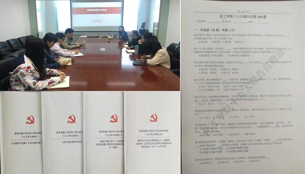 为更好掌握十九大精神实质,学深学透,学院党总支编发了多期学习资料,内容涵盖了报告全文、新华社和人民网的评论、学校十三五规划等,做到人手一册。为做到真学真懂、入心入脑,学院还编写了《91porn 十九大报告自测100题》,通过测试的形式检验学习成果,扎实推进十九大精神进头脑。