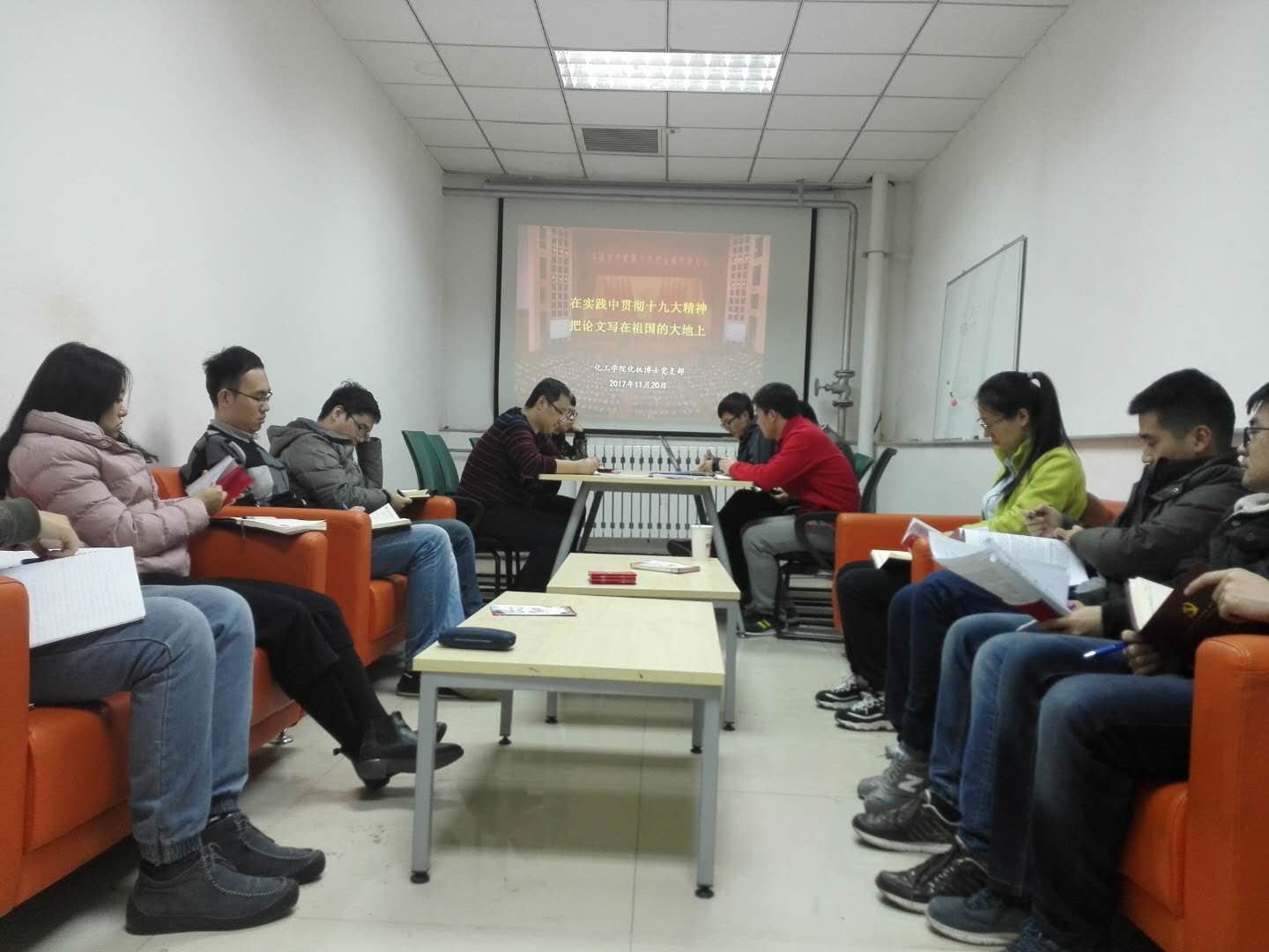 化机博士党支部于20171120日在91porn 实验楼401召开了党组织生活会,旨在深入学习领会党的十九大精神,将十九大精神落在实处,结合学校“双一流”建设的实际,联系自身科研工作的体会,参照91porn 印发的《党的十九大报告》、《新华社九论学习贯彻党的十九大精神》、《这些年,习近平总书记对青年的青春寄语》、《人民日报及新华社评论》、《西交党发[2017]44号文件》等十九大学习材料,开展了题为在实践中贯彻十九大精神,把论文写在祖国的大地上的专题学习讨论。党支部书记张洋同志主持会议,学院党委委员、院长助理杨贵东同志全程参加。