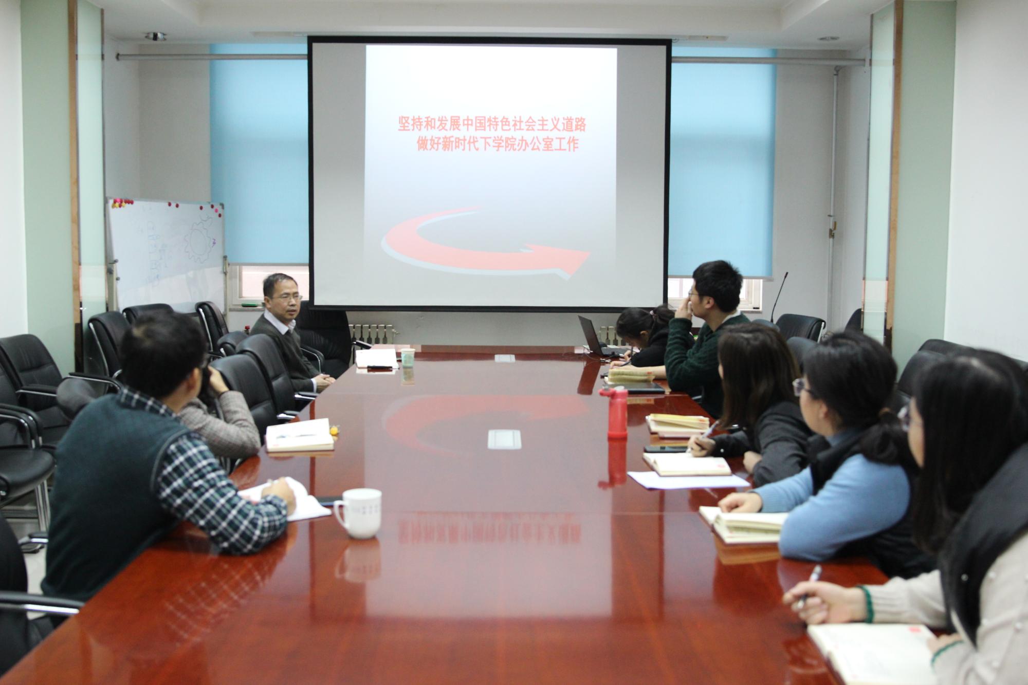 12月25日下午,学院分党委副书记、院长魏进家走进行政党支部,开展分党委委员讲党课活动,为支部党员做了题为《坚持和发展中国特色社会主义道路,做好新时代下学院办公室工作》的报告。行政党支部全体党员以及其他办公室工作人员参加了本次党课活动。