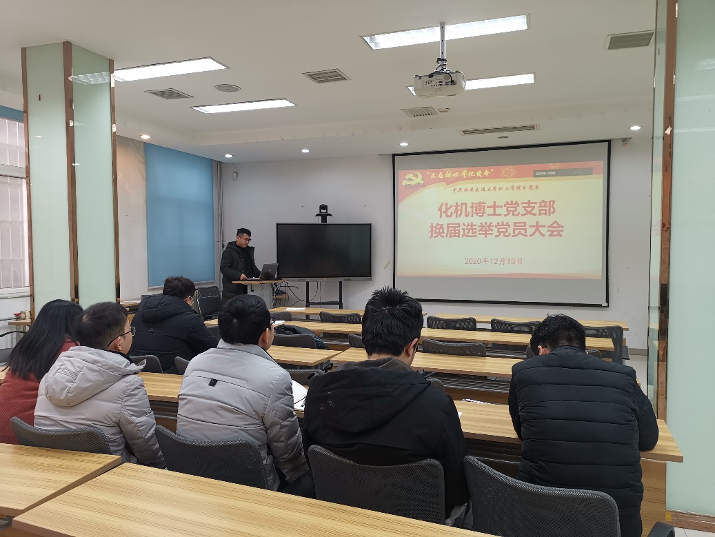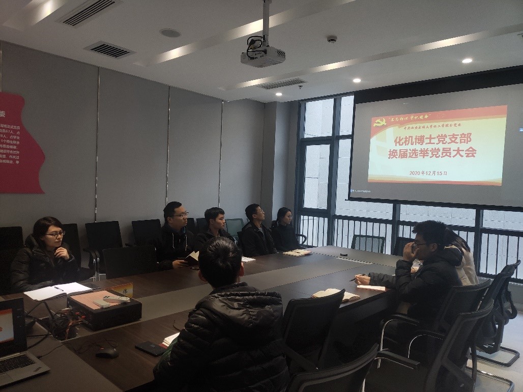 12月15日,化机博士党支部在教学二区106会议室和创新港2192会议室同步召开支部换届选举党员大会。会议由支部组织委员文孟刚主持,分党委秘书严辉英、化机博士党支部全体成员参加了会议。