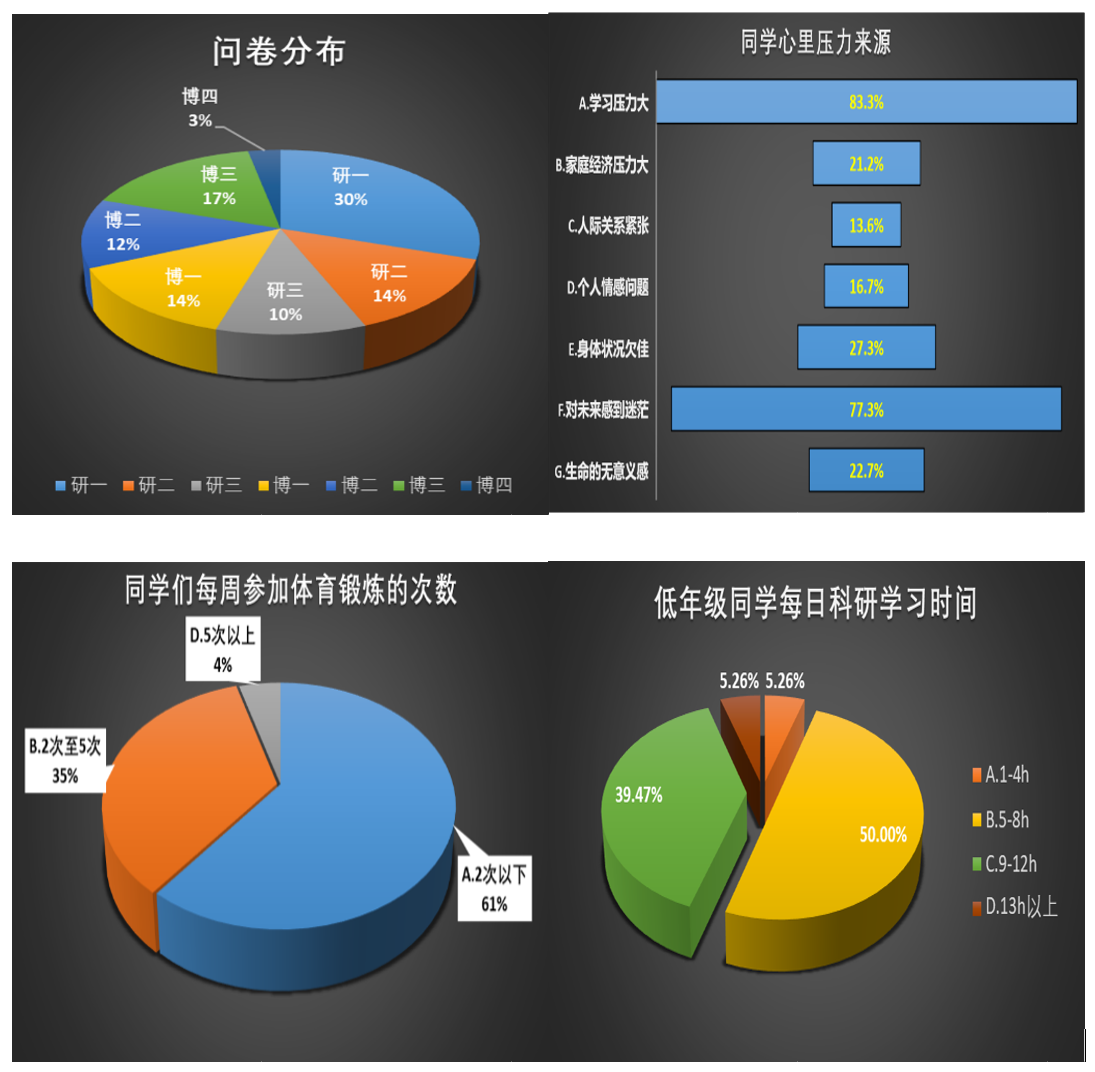 各个年级的研究生,调研发现:大部分同学在心理状态方面面临的首要问题是感觉学习压力大,其次是对未来感到迷茫。同学们在遇到烦恼时倾向于找朋友倾诉或者选择选择自己慢慢消化,大家普遍认为线下心理咨询有助于缓解烦恼但绝大多数同学都不习惯去做心理咨询;在宿舍生活方面,同学们对宿舍整体满意,部分同学提出偶尔存在热水停供、休息时间施工等问题;在体育锻炼方面,绝大多数同学运动时长短甚至存在不锻炼的情况,部分同学提出健身房健身器材过少等问题;在科研学习方面,部分同学反映文献查找、作图以及仪器设备使用方面存在问题。