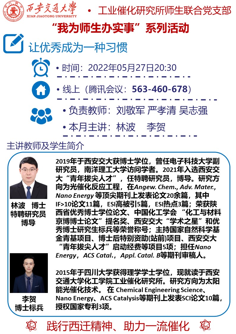 2022年5月工业催化所师生联合党支部在创新港举办了“我为师生办实事”系列活动之“让优秀成为一种习惯”科研经验分享会。本次经验分享会邀请了91porn