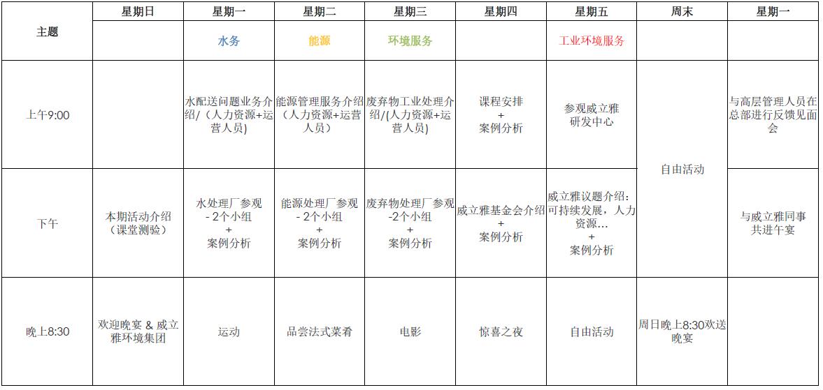 威立雅是一家专注于提供环境服务的世500强的法国公司,总部设在巴黎,每年会从全球名校选拔优秀学生参加在法国巴黎开展的为期一周左右的“暑期学校”活动。