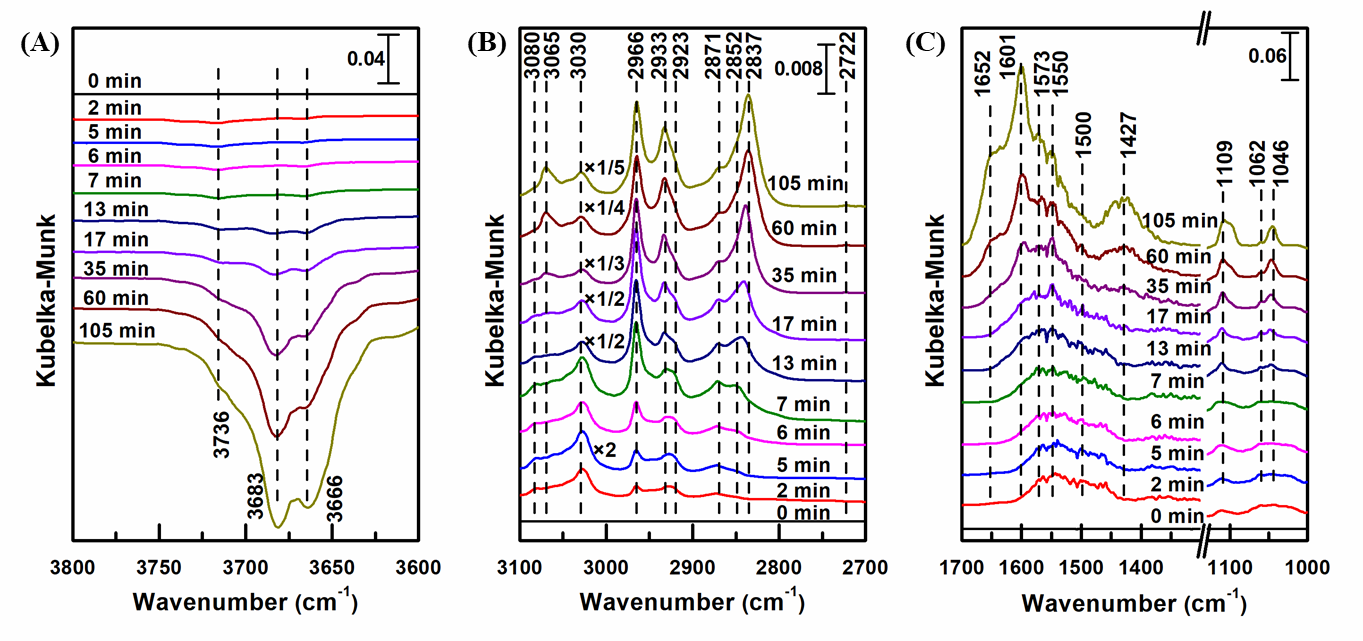 图2.棒状CeO2表面物种随时间变化的原位漫反射红外光谱图和反应路径示意图