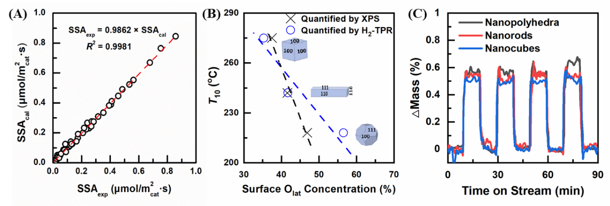 图1.(A)棒状CeO2甲苯催化燃烧面积比活性实验值与O2非解离吸附的MvK模型计算值对比图;(B)XPS及H2-TPR测量得到的表面晶格氧含量与T10关系图;(C)不同形貌CeO2催化剂OSC性能测试图