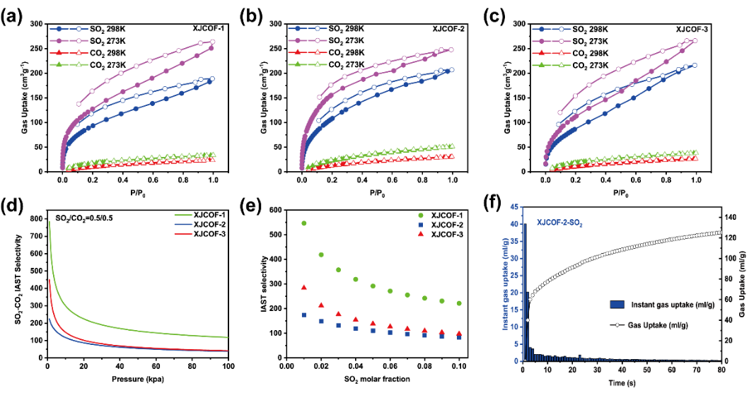 图2.两性离子COF对SO2/CO2的吸附分离性能测试
