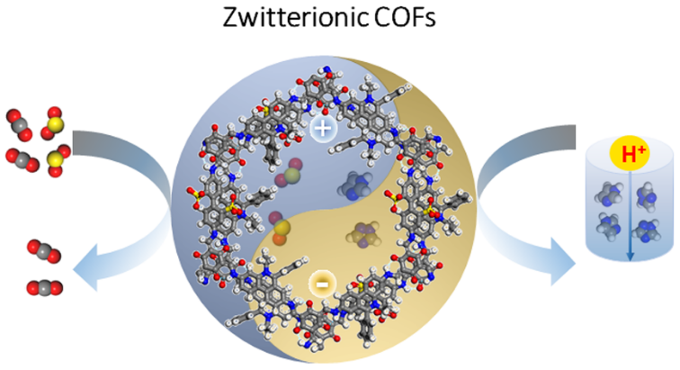 图1、两性离子COF作为多孔主体用于气体分离及无水质子传导示意图