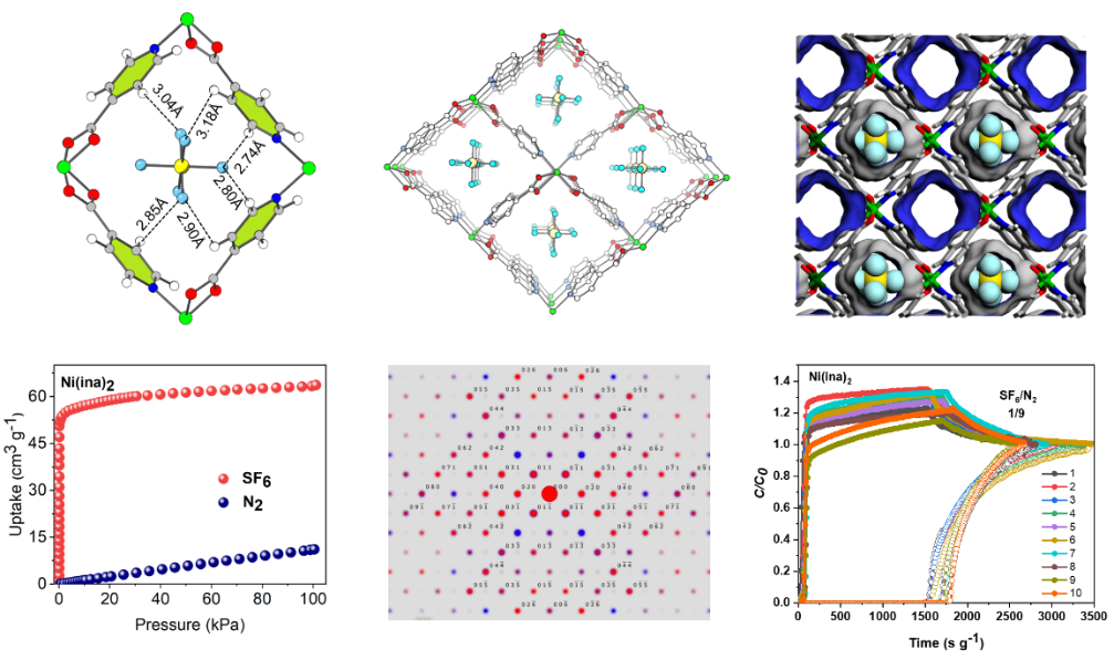 杨庆远教授课题组开发了系列具有不同孔结构的金属-有机框架(MOF)材料,用于六氟化硫的捕获。研究表明,具有一维纳米孔道且孔尺寸与SF6分子动力学直径相近的MOF材料具有良好的六氟化硫捕获效果。MOF材料Ni(ina)2的孔径为0.6 nm,和SF6的分子大小(0.52 nm)非常匹配,因此该材料表现出优良的六氟化硫捕获效果,Ni(ina)2在298K(0.1 bar)下的SF6吸附量为2.39 mmol/g,其SF6/N2分离比高达375。理论模拟计算和单晶结构解析表明Ni(ina)2框架和六氟化硫分子之间存在较强的作用力,可以从低浓度SF6-N2混合气中选择性地捕获六氟化硫分子。动态突破实验也进一步表明Ni(ina)2具有良好的SF6/N2实际分离效果,该工作为工业上含氟电子气体的捕获提供了思路。