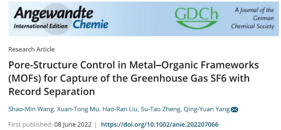 相关成果以“金属-有机框架(MOFs)的孔结构调控用于捕获温室气体SF6并具有创记录的分离比”(Pore-Structure Control in Metal–Organic Frameworks (MOFs) for Capture of the Greenhouse Gas SF6 with Record Separation)为题发表在《德国应用化学》(Angew. Chem. Int. Ed.)上,并被选为热点论文(Hot paper)。该研究工作由91porn