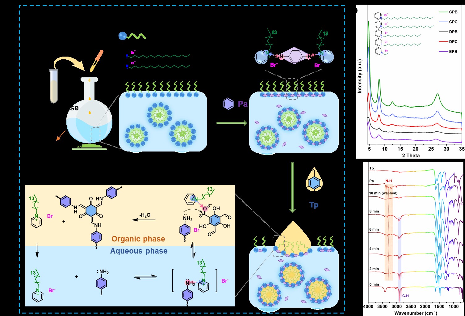 由于其功能、拓扑结构和连接方式的多样性,共价有机框架材料(COFs)已成为结构设计和功能定制的有机功能材料的强大平台。COFs在许多领域如气体储存和分离、传感器、电池、催化等具有重要的应用。然而,传统的溶剂热合成方法需要较高的温度、真空操作和较长的反应时间,限制了COFs的形貌控制和规模化应用。尽管越来越多的新的合成方法被报道出来,但如何实现常温常压合成、预先设计和控制形貌仍然是一个挑战。因此,开发一种新的温和条件下合成形貌可控的COFs的合成策略十分必要。