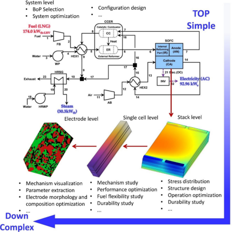 该综述文章采用自上而下的方法,从系统、堆栈、单电池到电极的尺度,全面总结了SOFC模拟研究的最新进展。图2展示了论文从系统、堆栈、单电池再到电极综述的逻辑架构。论文首先介绍了SOFC的发展历史、工作原理及当前面临的挑战,随后详细讨论了SOFC系统模型、电池/堆栈模型和介观模型的研究进展。特别值得一提的是,该综述首次将人工智能辅助模型、异质模型等新兴模型纳入讨论范围,为SOFC的多尺度设计和优化提供了新的思路。最后,综述提出了SOFC模拟研究面临的挑战和未来展望,强调了多尺度模拟在SOFC设计和优化中的重要性。该项研究不仅为研究人员提供了选择合适模型的指南,还为SOFC数值模拟的未来发展指明了方向,推动了数值模拟在SOFC研发当中的深入应用。