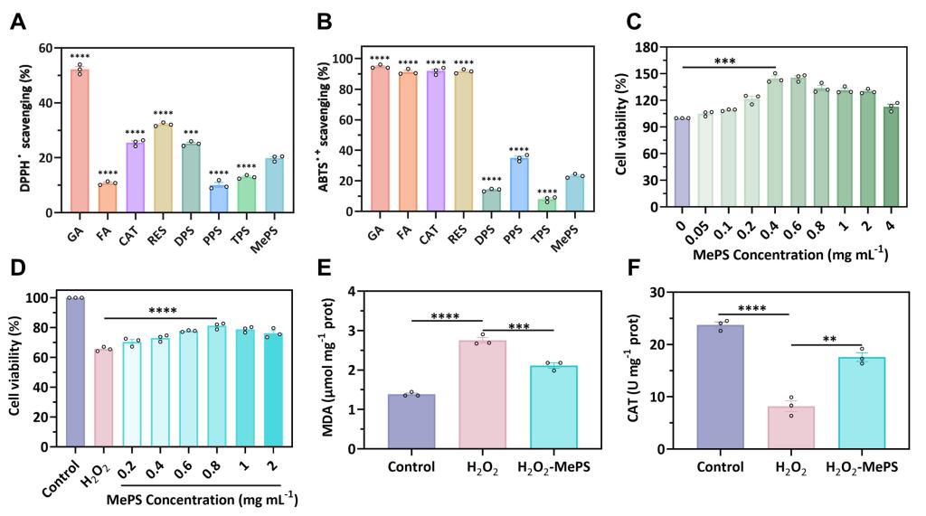 为深入研究甲烷基多糖的生物活性方面,研究团队开展了化学测试和细胞验证实验。结果显示,甲烷基多糖的自由基清除能力显著高于阿魏酸以及石斛、茯苓、银耳等天然植物源多糖。巨噬细胞培养实验进一步证明,添加甲烷多糖不仅能促进正常细胞的增殖,还可以通过降低脂质过氧化物含量和修复抗氧化酶活性,将氧化损伤胁迫下细胞的存活率提高近20%(图2)。这一结果有力地证明了甲烷基多糖具高抗氧化活性,为其在生物医用材料领域应用奠定基础。相关研究成果已发表于国际知名期刊《Journal of Agricultural and Food Chemistry》,91porn 为第一通讯单位,费强教授、傅容湛教授、范代娣教授为共同通讯作者。